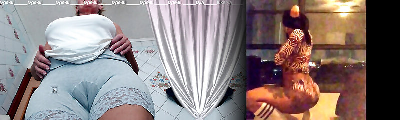 A hot housewife in the kitchen cheerfully removes homemade shorts and displays lace shorts, flirting online on web cam with