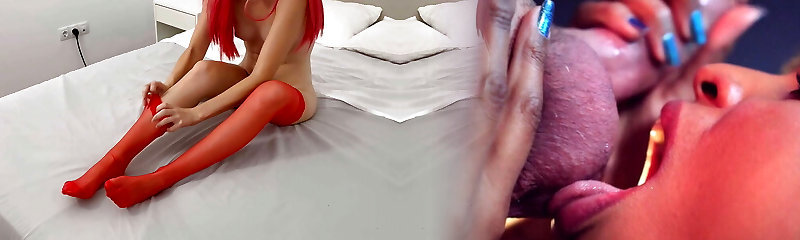 The hot neighbor gives me a good feetjob in red stockings until I jism slowly