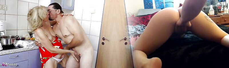 German old Granny Erika 73 seduce to Pummel in kitchen by Young Guy