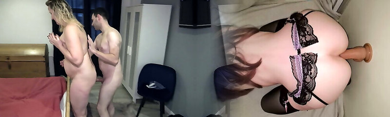 Milf in bodysuit fishnet rough fucket with faux-cock and trouser snake in both holes