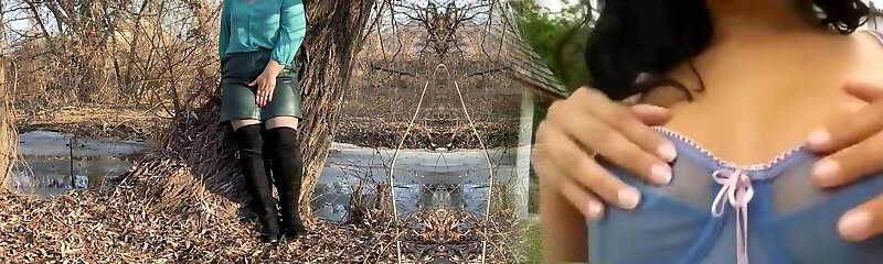Curvaceous MILF in a leather skirt and lengthy boots masturbates outdoors without taking off her pantyhose