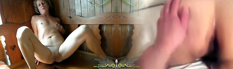 Horny granny with flat tits fingering her gash in sauna