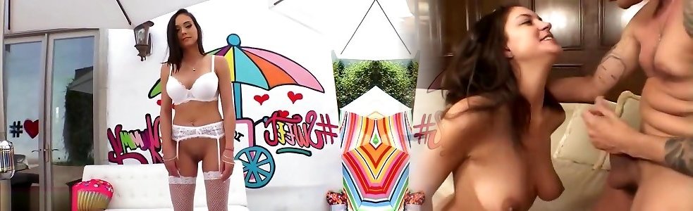 New naughty 21 yo Ashly brunette amateur stockings schoolgirl gets fingered and rails fuckpole on top
