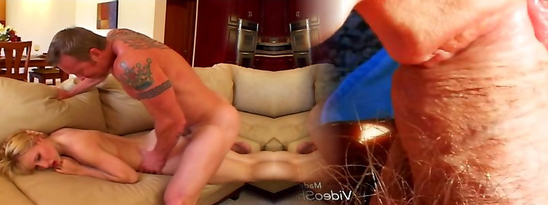 Stunning towheaded bitch Emma Mae had amazing doggy stance hump on red sofa