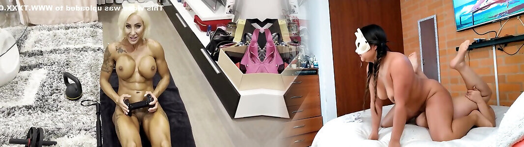 Gigantic bodybuilder flexes her big muscles as she strips out of her underwear