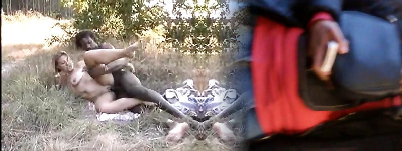 Blond babe with phat lips enjoys taking bick ebony shaft in her honeypot outdoors
