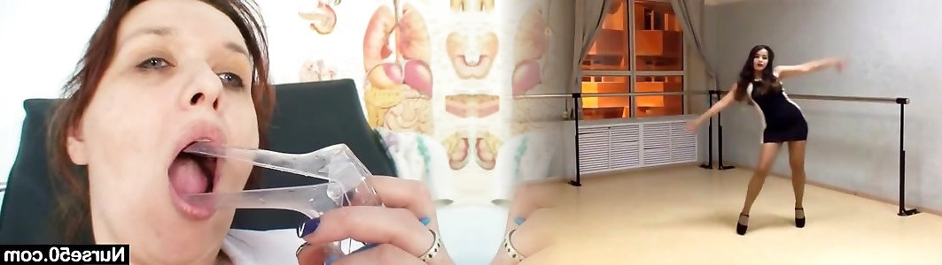 Dame nurse toying with herself with gynecology-contraption