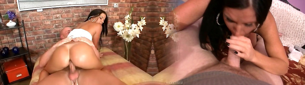 Wondrous alluring black-haired with ample breasts rides and deepthroats mighty contraption