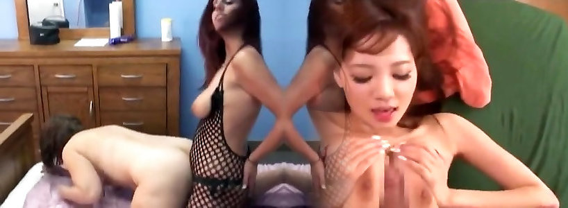 Fortunate fellow has two cuties in mini skirts fellating his device