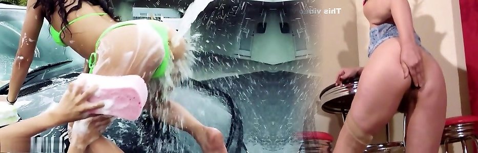 2 sensuous truck wash stunners in cool bikinis take turns on a giant trunk