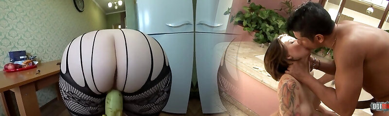 Girlfriend with zucchini poked busty milf in the kitchen, lesbians POV.