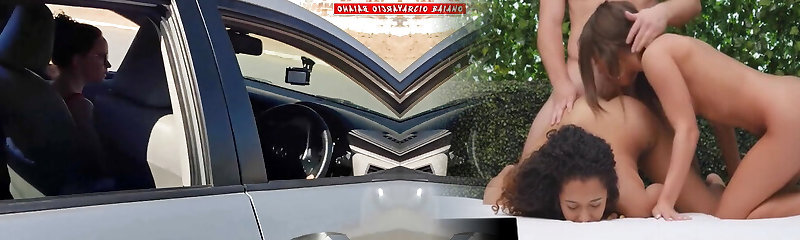 Lesbian fucked mature milf in the car. Large melons and fat ass in sexy underwear. POV.