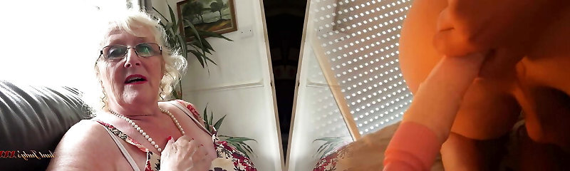 Granny in glasses sucks guy off