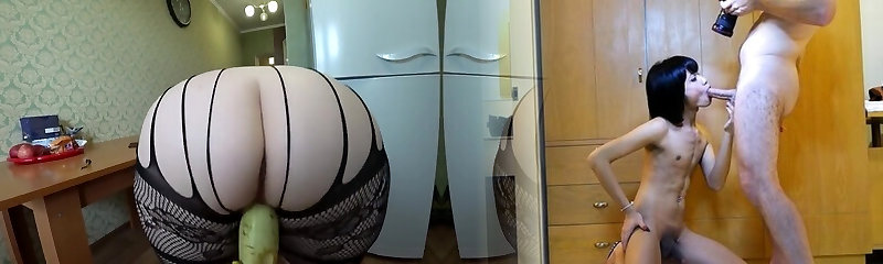 Girlfriend with zucchini poked busty milf in the kitchen, lesbians POV.